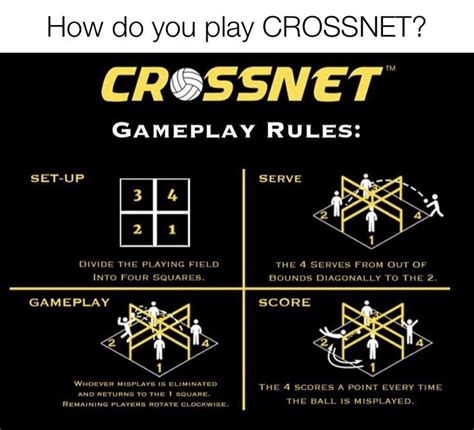 Crossnet Volleyball Rules. Learn all about how to play and how to set up the most popular four square volleyball game. Adjustable height for all ages and skill levels.